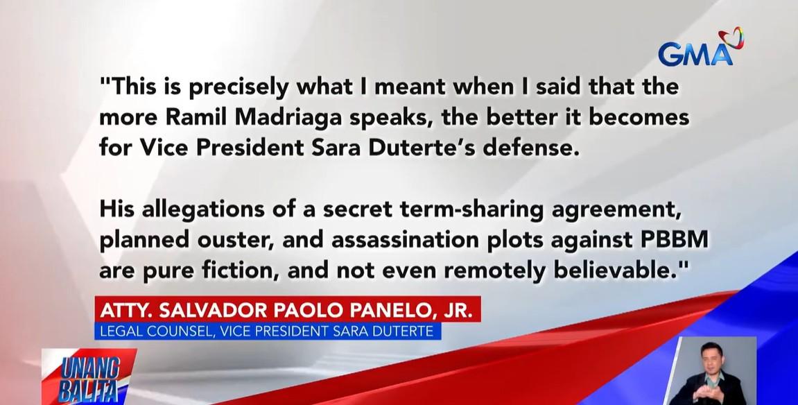 The camp of Vice President Sara Duterte on Tuesday rejected the allegations by Ramil Madriaga, who identified himself as her former aide and supposed bagman, calling his statements “pure fiction” and lacking evidence.
