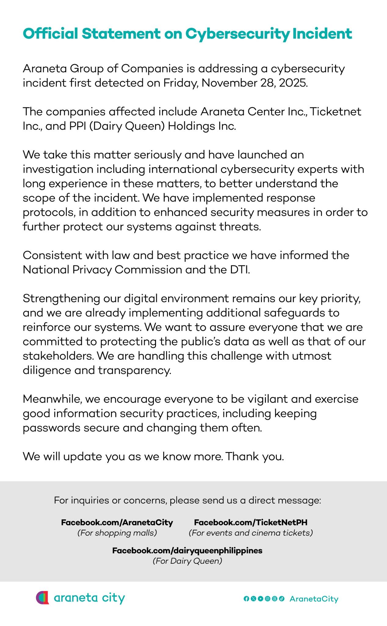 The Araneta Group of Companies on Monday said it is investigating a cybersecurity incident that affected three of its business units as it assured that adequate security and response protocols have been implemented to address the breach. In a statement, the Araneta group said the breach was detected on Friday, November 28. The affected units include the Araneta Center, Inc., Ticketnet Inc., and PPI (Dairy Queen) Holdings Inc.