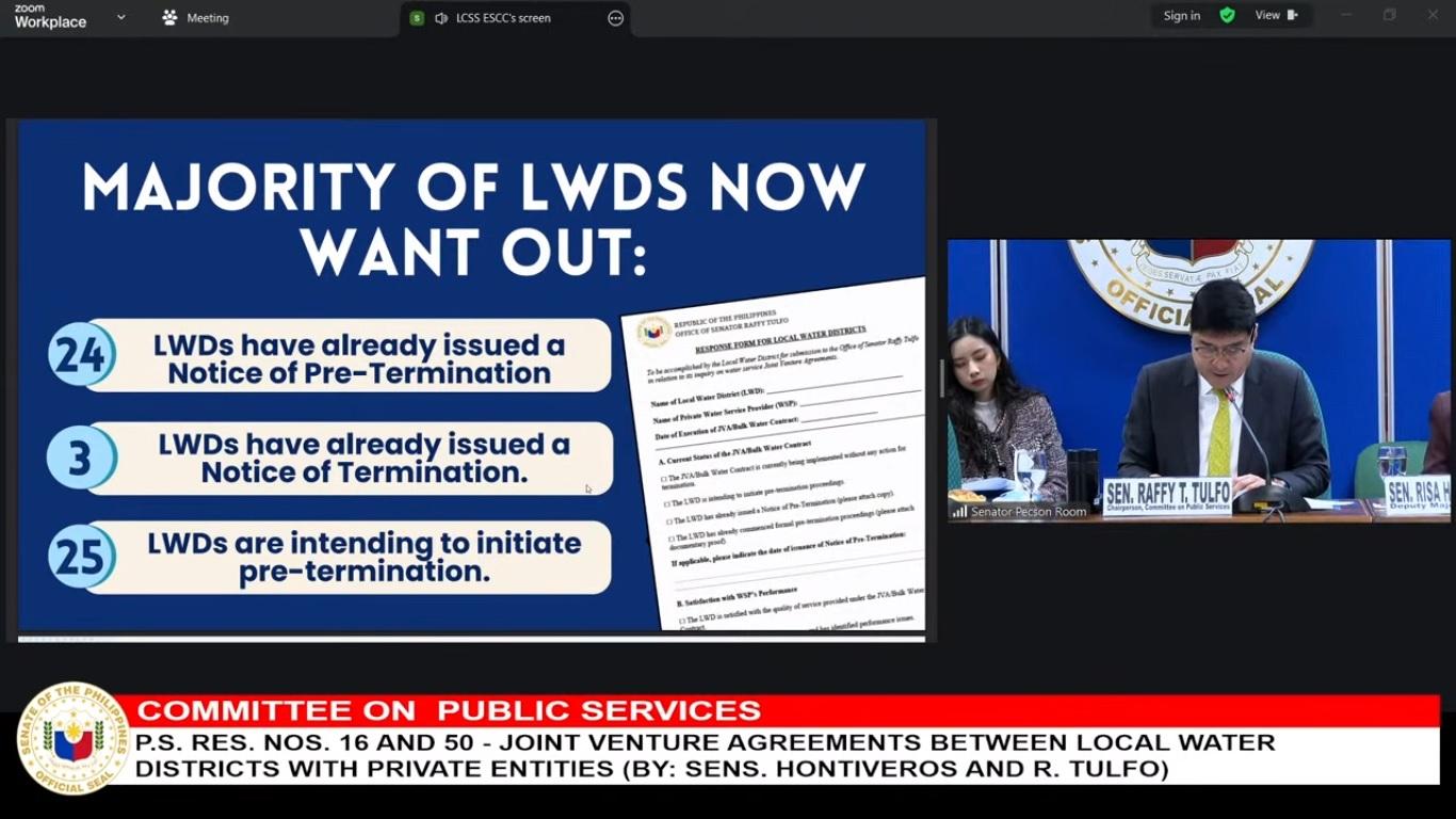 Senator Raffy Tulfo on Wednesday said 61 local water districts were not satisfied with PrimeWater’s services, and many of them also wish to terminate their joint venture agreements (JVAs) with the water service provider.