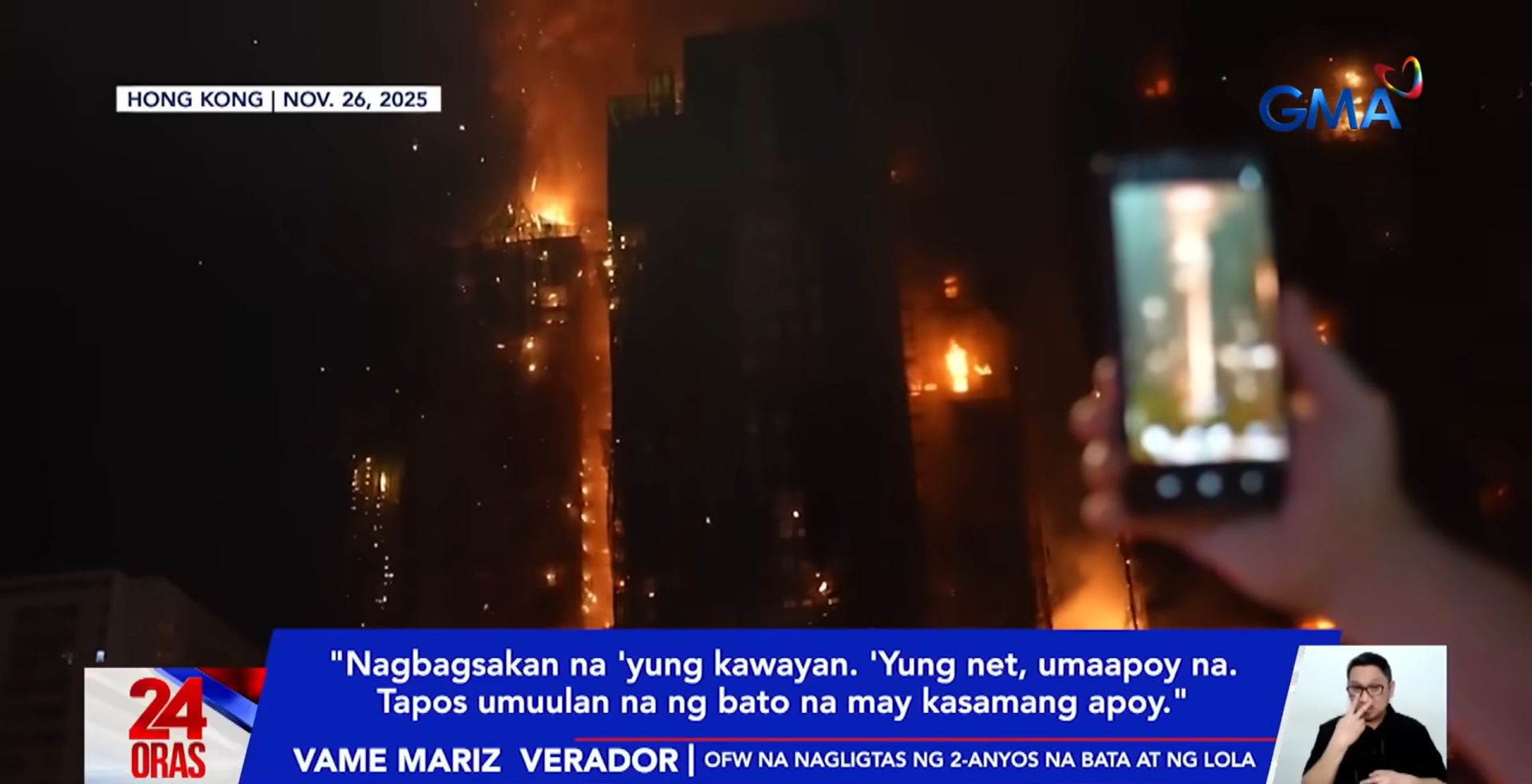 An overseas Filipino worker (OFW) shared her experience rescuing a child and an elderly woman from the massive fire that hit a residential complex in Hong Kong on November 26.