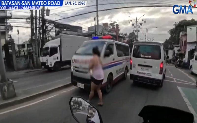 A woman, who was crossing a street connecting Quezon City and San Mateo, Rizal, was hit by one of two ambulances going counterflow due to traffic congestion, according to a report on “24 Oras” Tuesday.